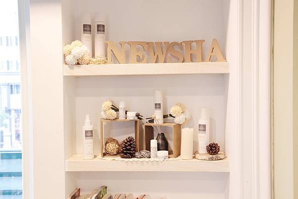壁櫃上NEWSHA 產品設計擺飾,替Moon Hair Studio 多了點文青風。